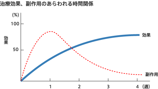 効果が現れる前に副作用が先に起こるので、薬に対して不安を持つこともあると思いますが、たいていは徐々に治まってきます。