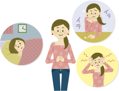 | 身体的症状 | 睡眠障害、頭痛、目のかすみ、耳鳴り、口の渇き、肩こり、胃痛、息苦しい、吐き気、動悸、めまい、倦怠感、発汗、疲労感、性欲減退、月経不順 |