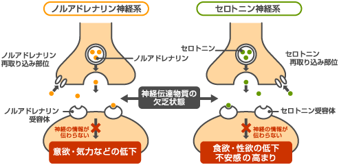 睡眠や食欲、感情などに影響しているといわれる脳内のセロトニンとノルアドレナリンという神経伝達物質が減少してしまった状態がうつ病というものです。